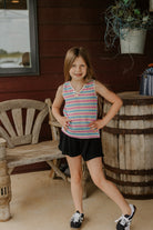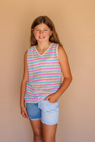 Get ready to rock the summer in this Girls Open Knit Multi Stripe Boxy Tank! Made with a soft and stylish multi stripe fabric, it features a round cut neckline and sleeveless design for a cool and casual look. Perfect for any day out!