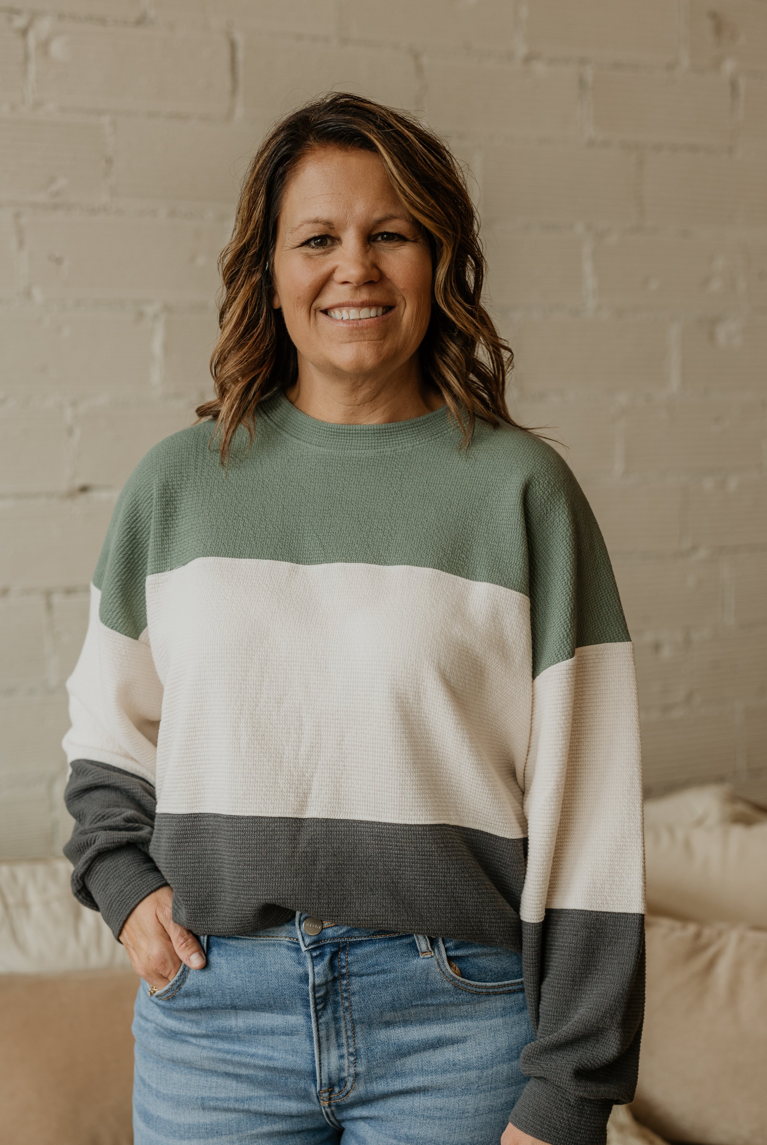 This cozy knit top brings playful charm to your wardrobe with its dreamy colorblock design in sage, cream, and charcoal. The round neck and soft, cloudy texture make it perfect for layering or wearing solo on cooler days. Embrace comfort and style with a fun twist that brightens your everyday look.