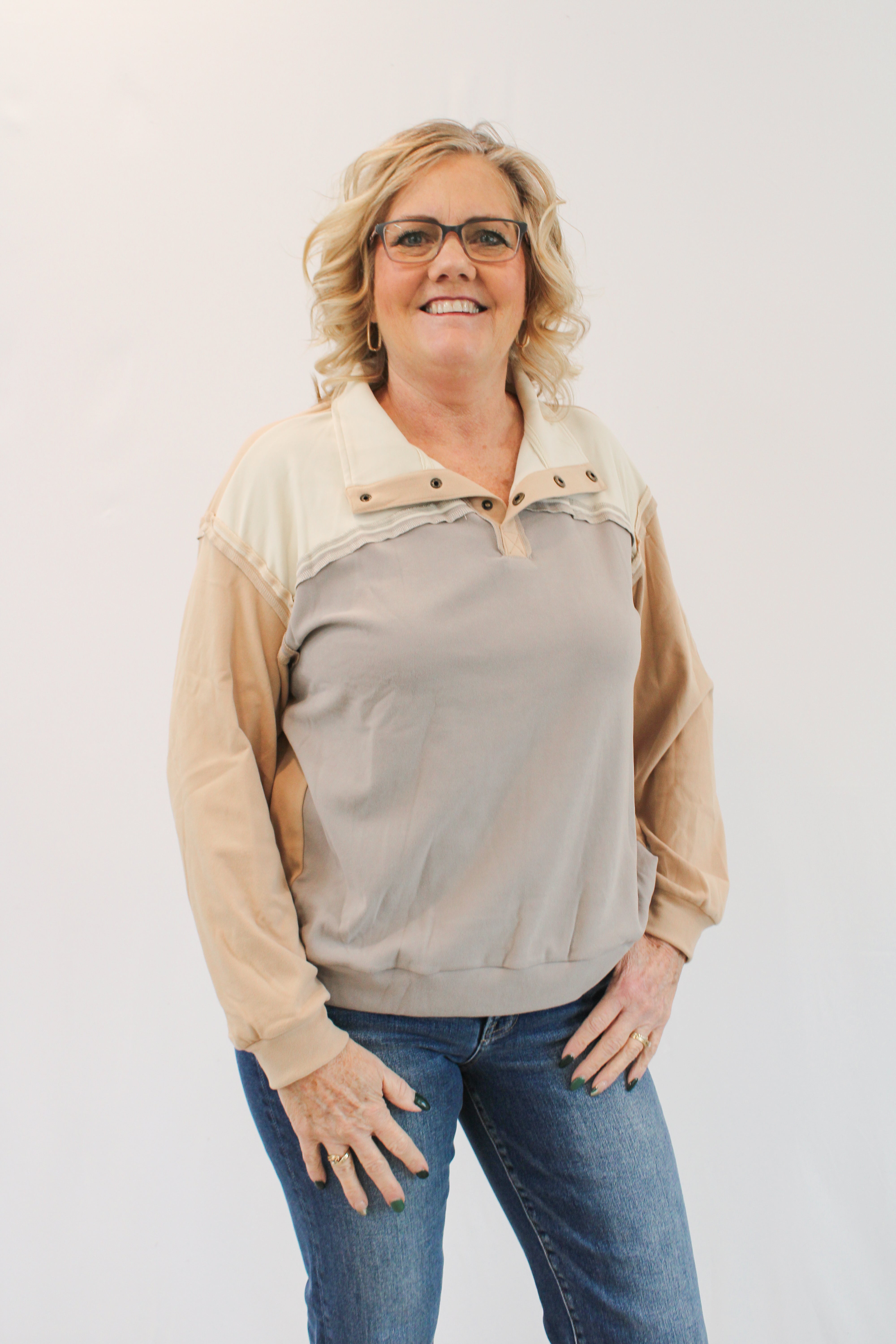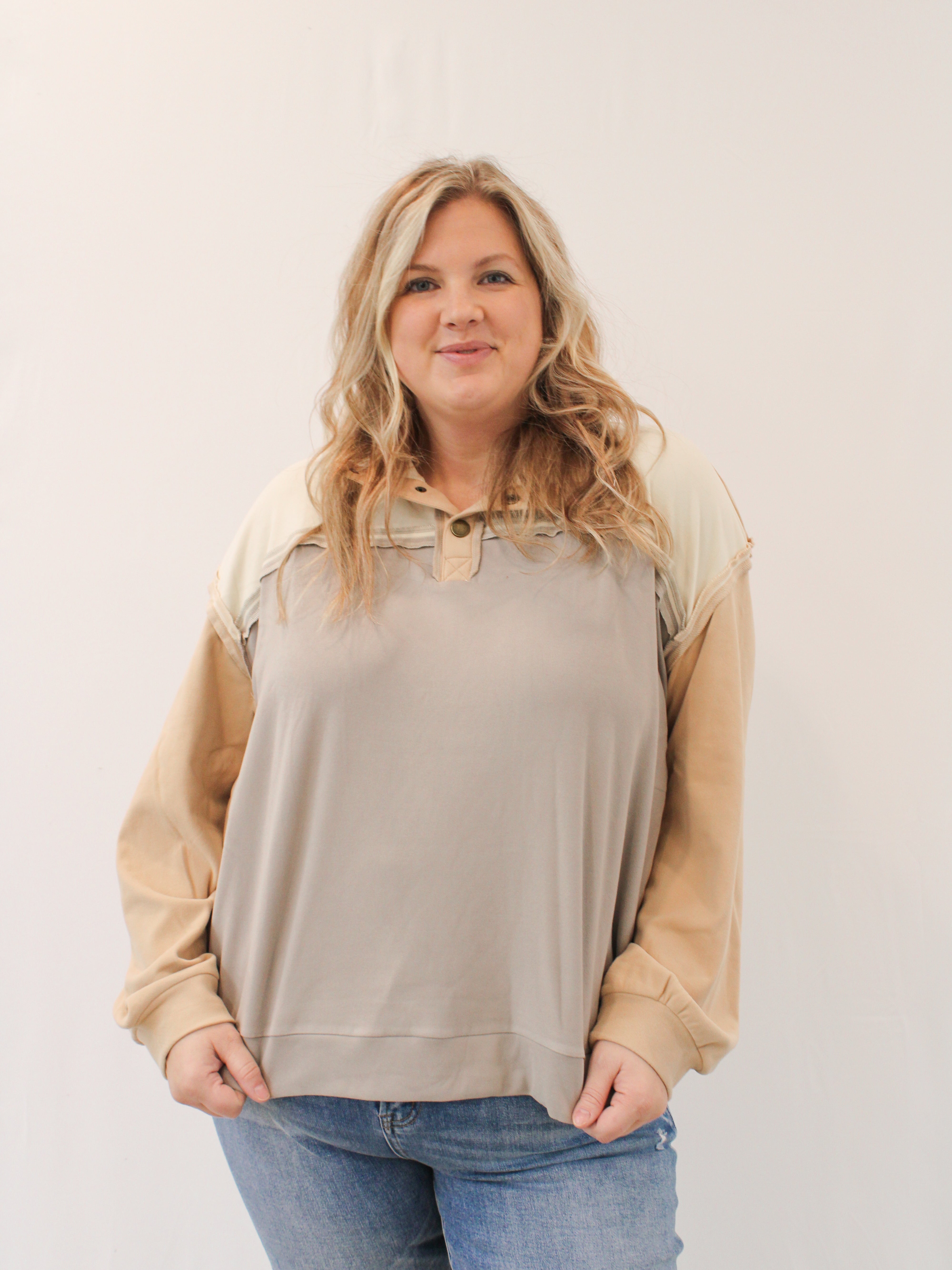Introducing MARIEL - the stylish and versatile top that's perfect for any occasion. With a unique half-button up neck and eye-catching color blocked design, this long sleeve knit top is both comfortable and fashionable. Plus, the thumb hole sleeves add a trendy twist. Made from a lightweight knit fabric, you'll never want to take it off!