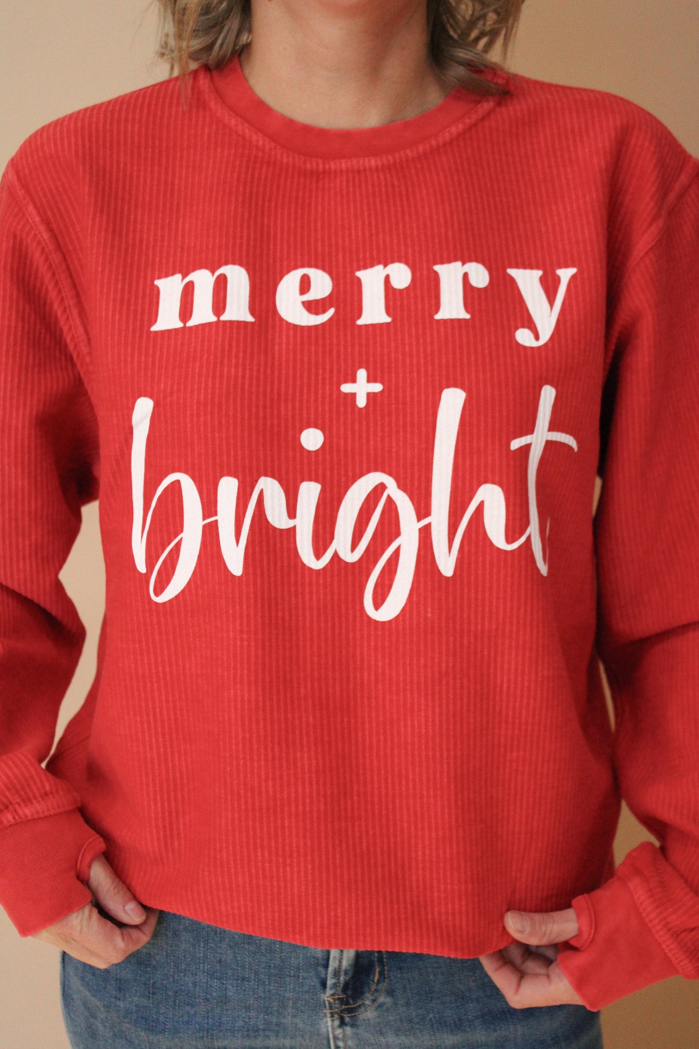 Cozy up with the Merry And Bright Comfy Cord, designed with a soft textured, 100% cotton fabrication for all-day comfort. This unisex fit sweatshirt features playful thumbholes that keep your hands warm and add a fun twist. Screen printed with "Merry + Bright" across the chest, it's perfect for spreading festive cheer wherever you go.