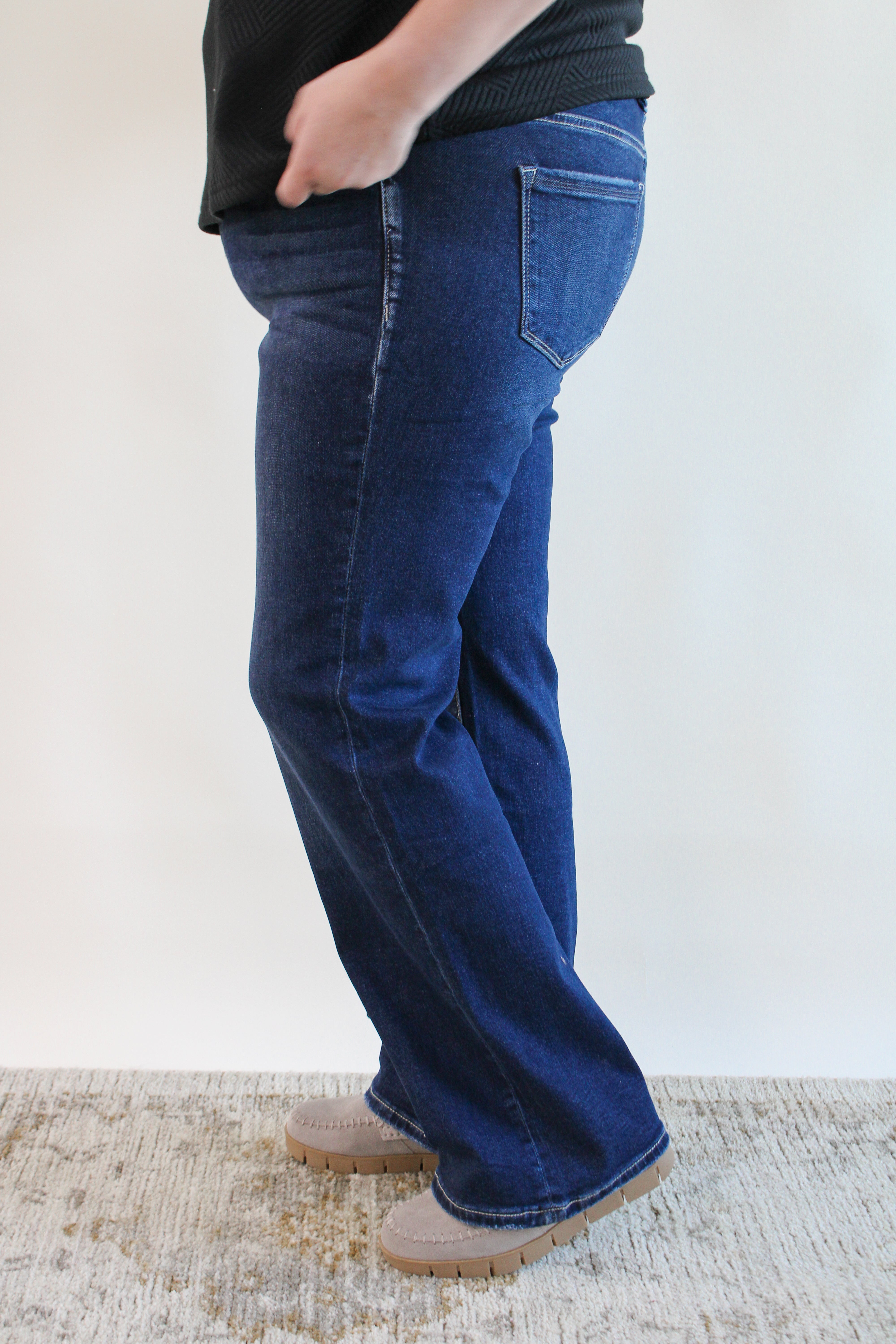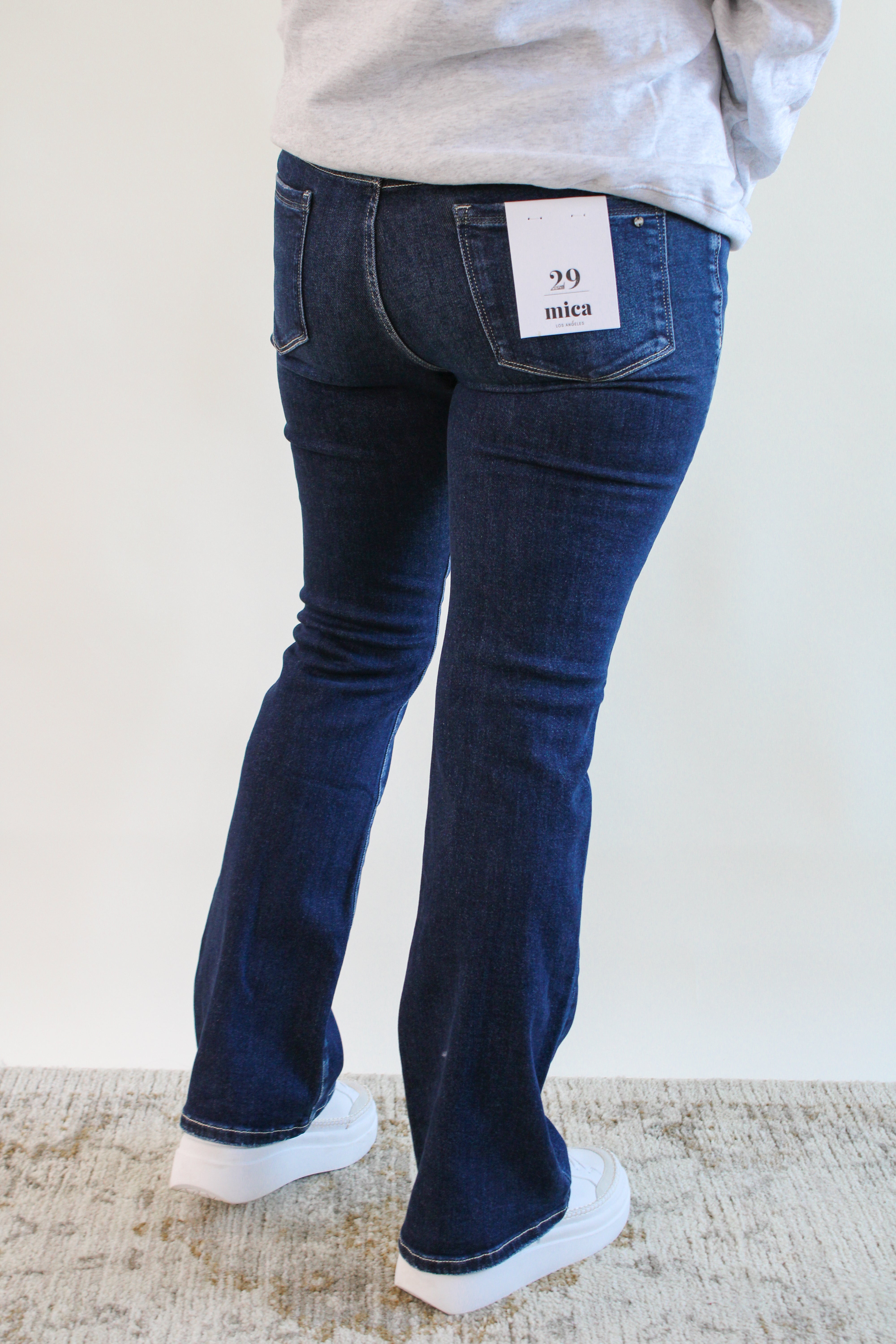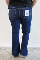 Introducing our playful and quirky mid-rise boot cut jeans with a unique back slit for added flair. Made with a comfortable blend of cotton, polyester, and spandex, these jeans will keep you stylish and comfortable all day. With a front rise of 9 inches, they're the perfect addition to your wardrobe.