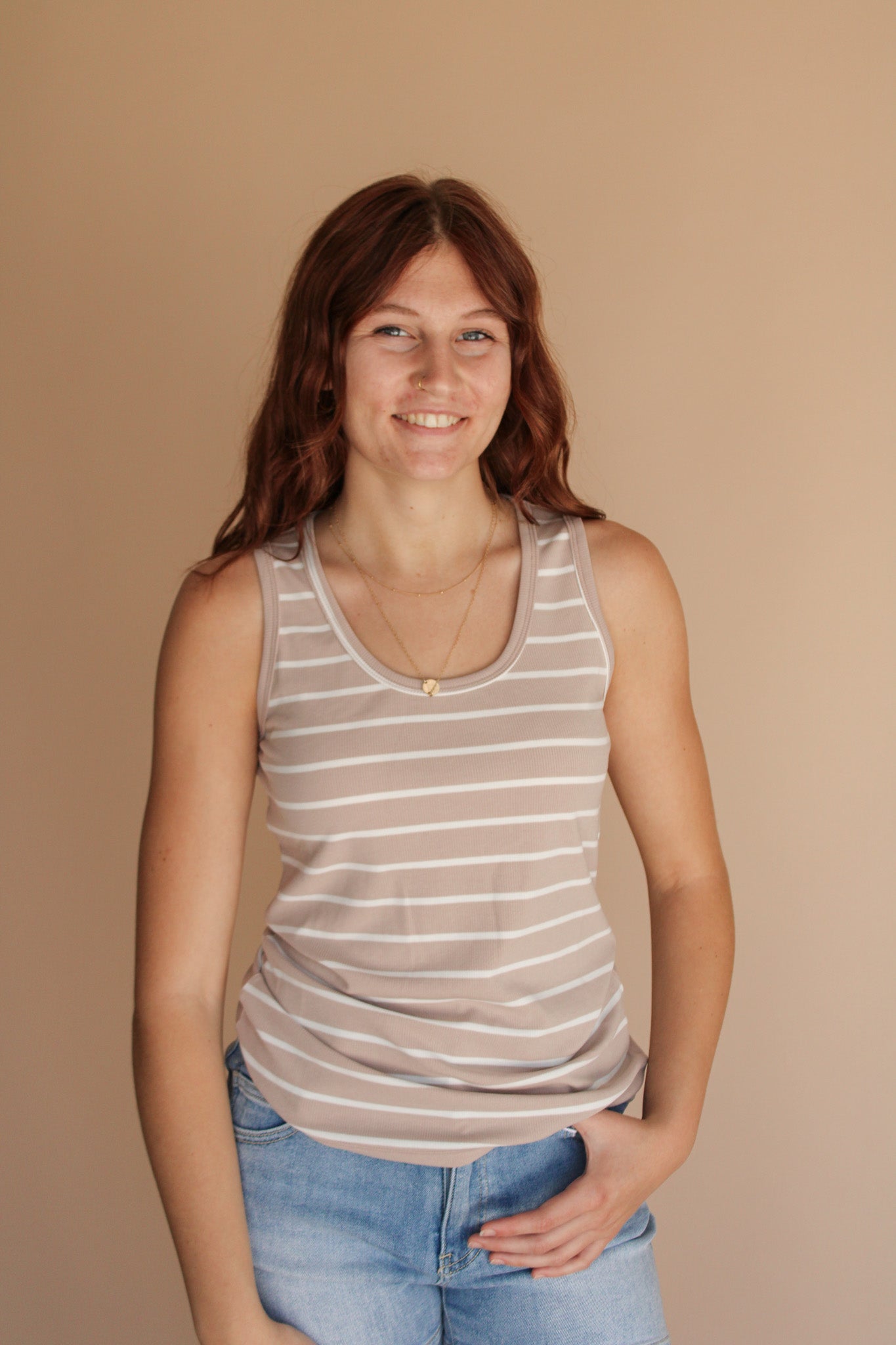 This sleeveless fitted tank features a playful striped pattern and a classic round neckline, perfect for adding a fun, flirty touch to your summer wardrobe. Its snug fit highlights your silhouette while keeping you cool and comfortable all day long.