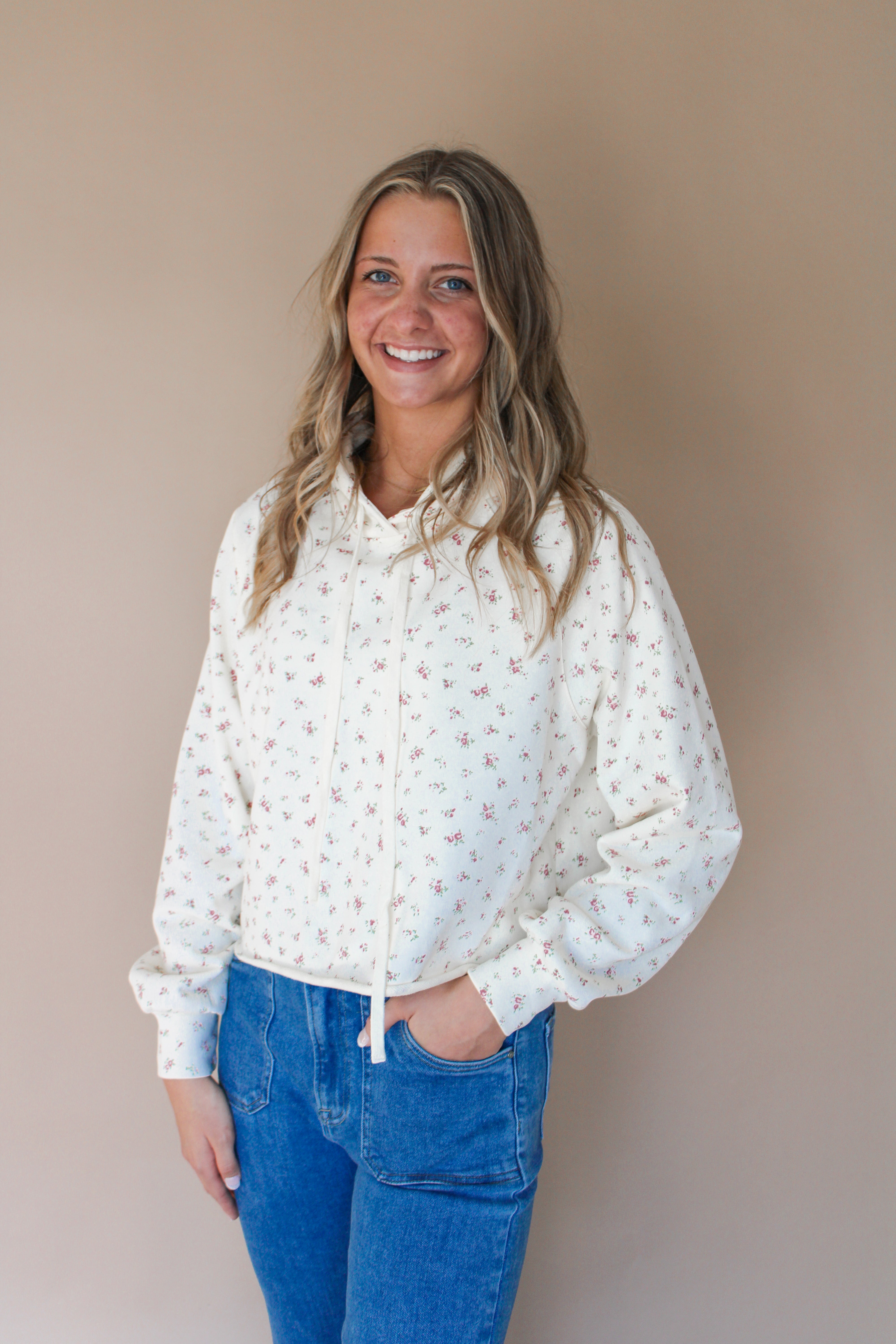 Embrace effortless comfort with this charming hoodie featuring an allover delicate blue floral print on a soft knit base. The relaxed pullover silhouette offers a slightly cropped length, while the cozy hood with adjustable drawstrings keeps you perfectly snug. Long sleeves showcase subtle puff detailing at the wrists for a feminine touch. Whether you're lounging at home, running casual errands, or enjoying cozy mornings in, this versatile piece pairs beautifully with matching shorts or lounge pants. Sweet, soft, and designed for all-day comfort.