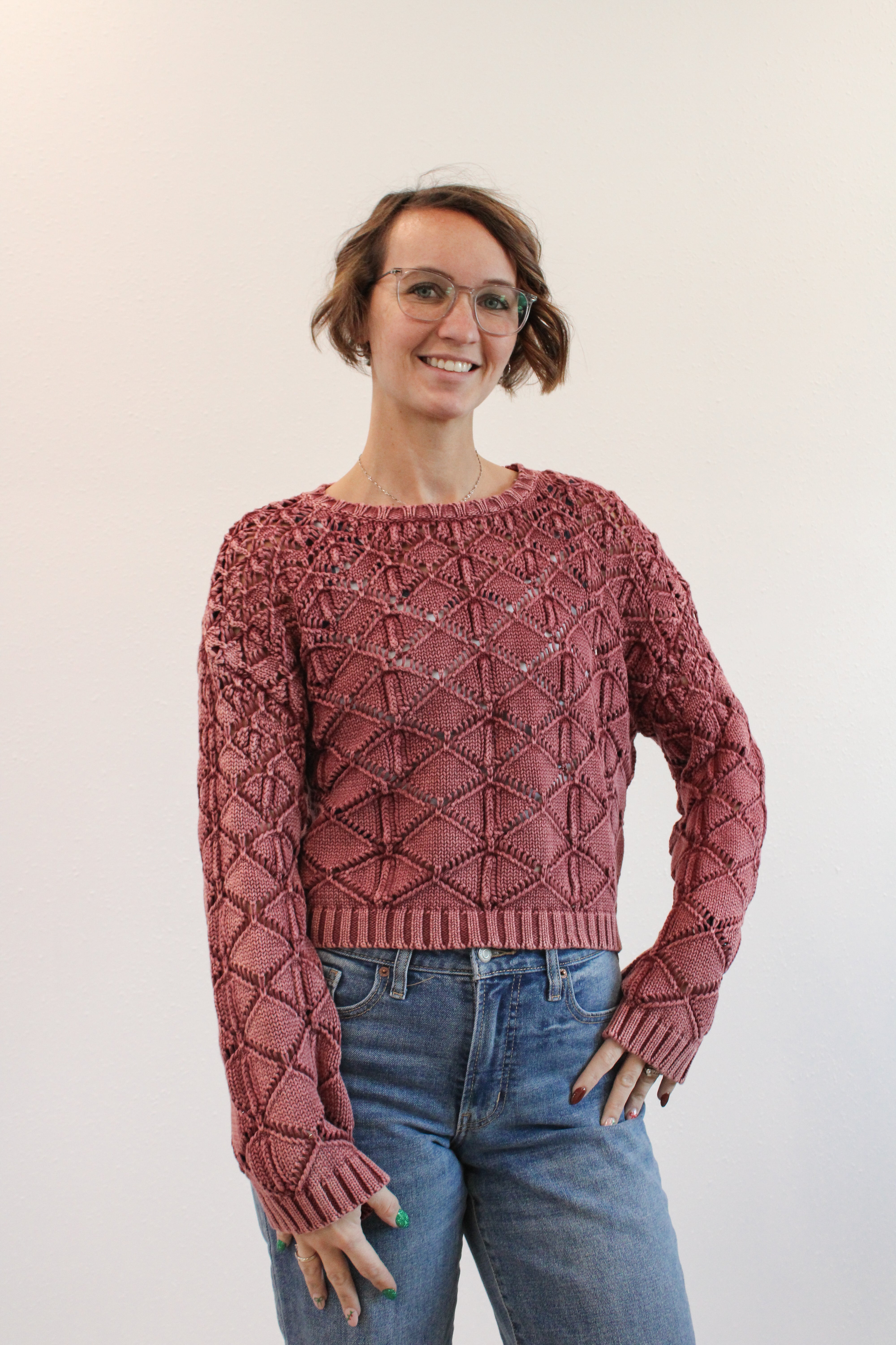 Stay comfortable with this sweater, featuring a relaxed fit, rounded neckline, and long sleeves. Its ribbed bottom band and cuffs add an extra touch of comfort, while the cropped length keeps you on trend. True to size for the perfect fit.