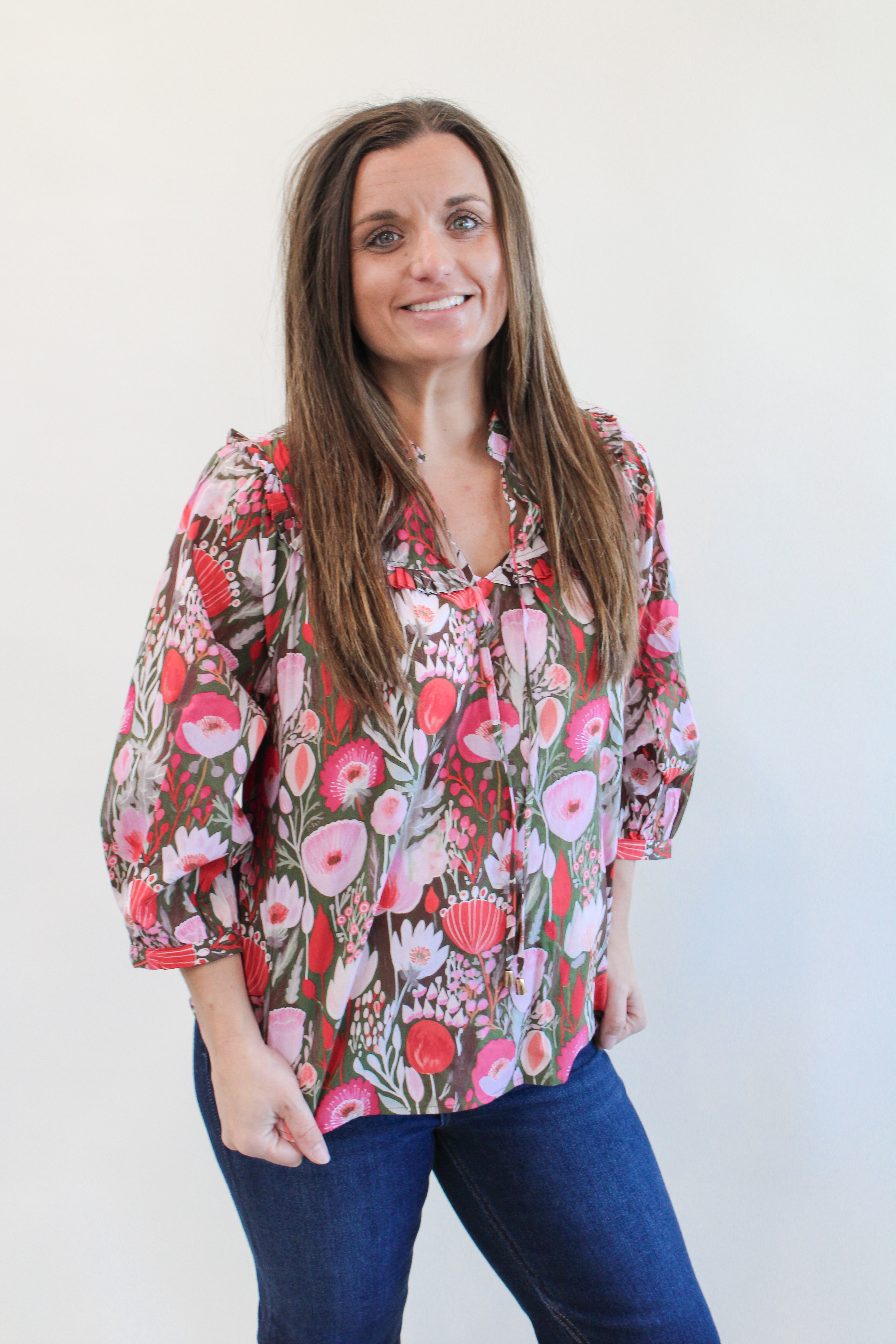 Bring some flower power to your wardrobe with the RINLEY FLORAL BLOUSE. This oversized top features a beautiful large floral print, ruffle neck, and 3/4 sleeves. Perfect for a playful, yet stylish look.