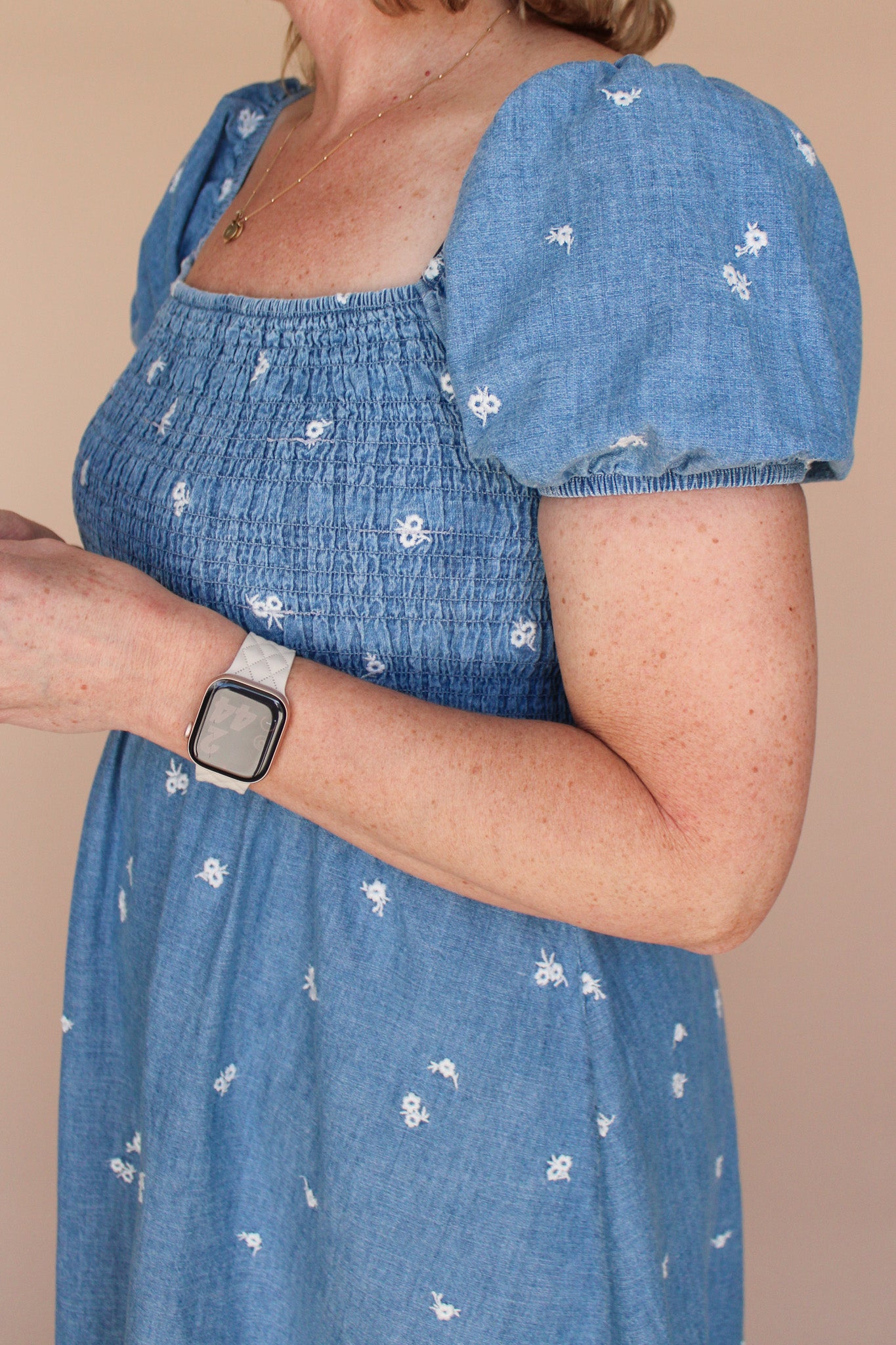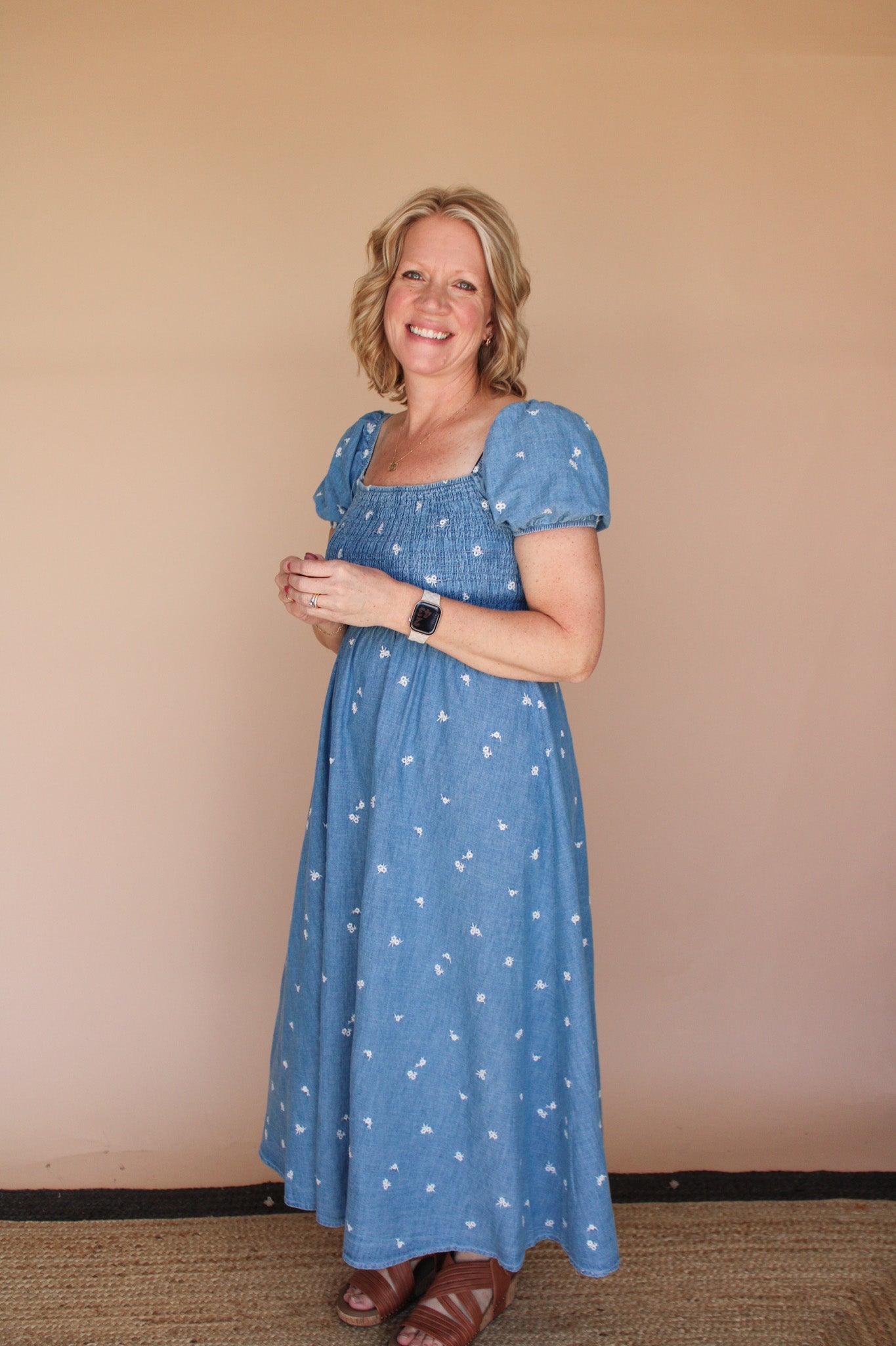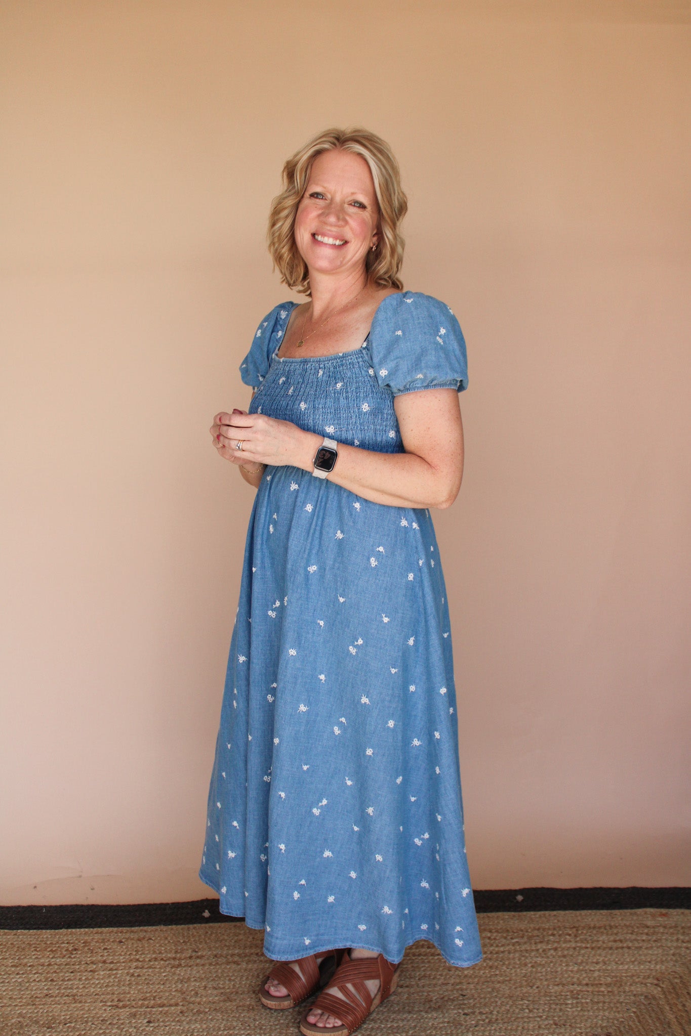 Embrace effortless elegance with this charming midi dress featuring a square neckline and delicate short puff sleeves. The smocked bodice creates beautiful texture and definition, while the flowing A-line silhouette flatters every figure. Adorned with intricate floral embroidery over a classic denim pattern, this piece combines timeless style with romantic details. Crafted from 100% cotton for breathable comfort, it's perfect for warm-weather occasions. Unlined design keeps it light and airy. Please note that color tones may vary slightly with each piece.