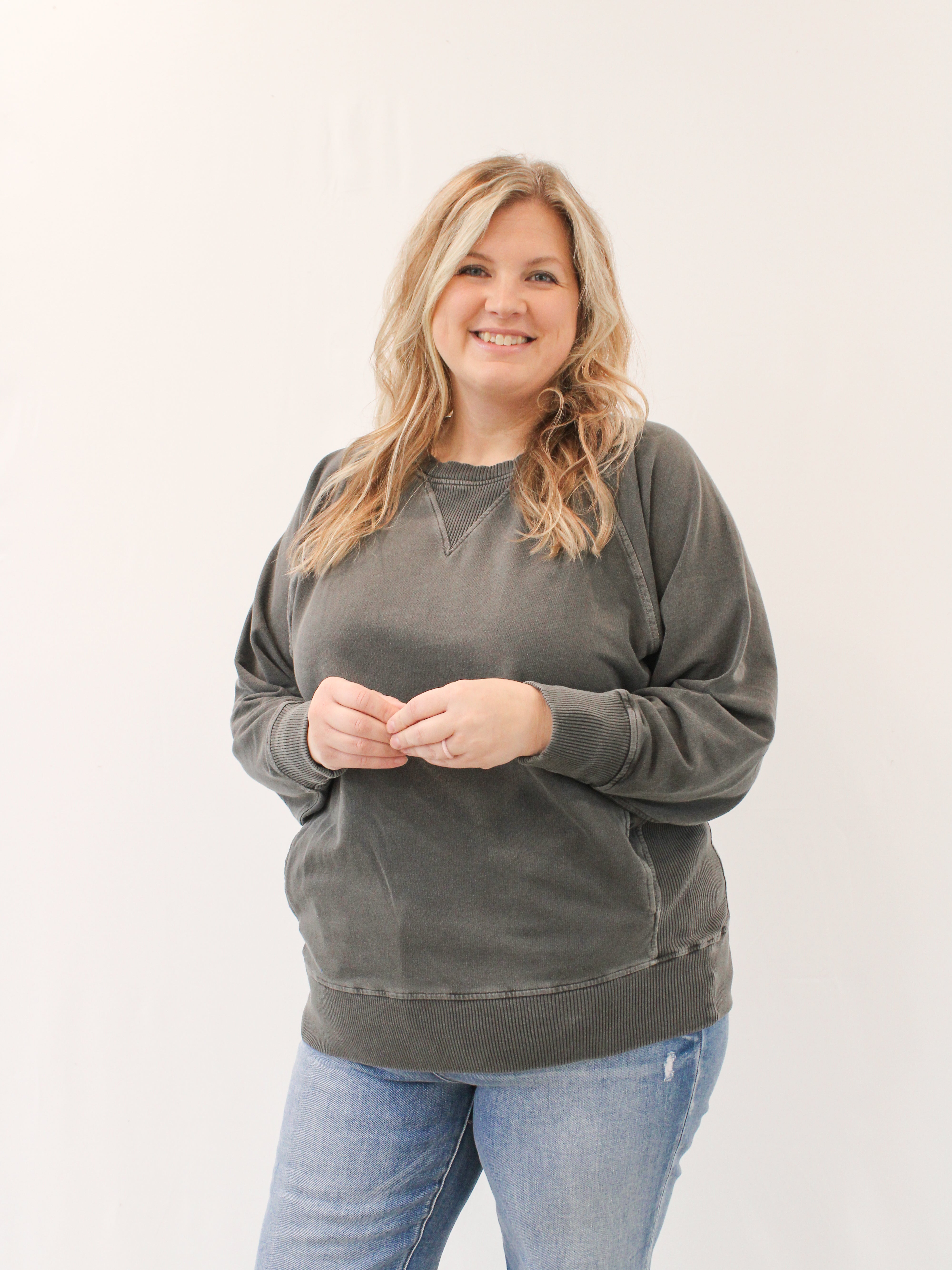 Get cozy and stylish with the SHANDA CURVY TERRY PULLOVER! Made with 100% cotton French terry, this plus-size pullover features ribbed detailing and convenient pockets. Perfect for any occasion, this pigment-dyed pullover will keep you comfortable and fashionable.