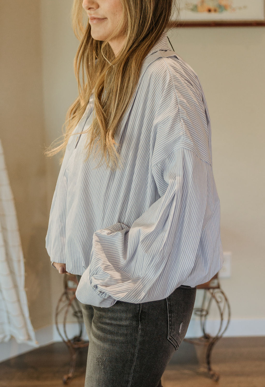 Introducing our Chic Pinstripe Blouse, the perfect combination of classic sophistication and contemporary style. Elevate any outfit, whether it's a casual day out or a formal occasion. This blouse is a must-have for any fashion-forward individual!